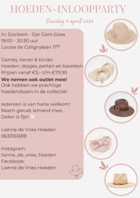 Op D.V. dinsdagavond 7 april van 19.00 – 20.30u is er in de kerk een hoeden-inloopparty. Een deel van de opbrengst is bestemd voor het gemeenteproject. Welkom!